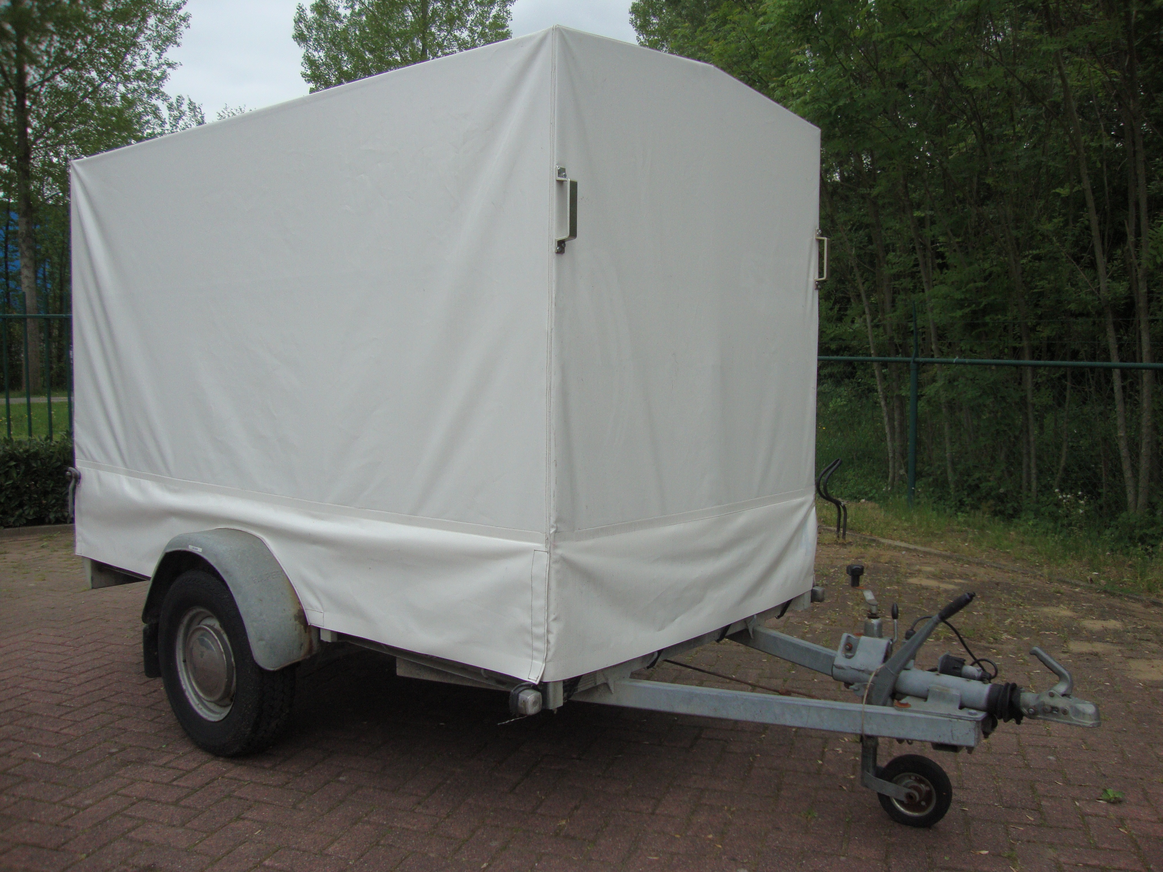 Wij verhuren een enkel-as aanhanger met huif met een laadvermogen van 1037 kg.
