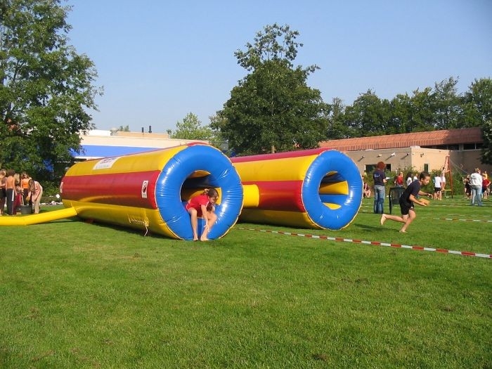 Huur nu een opblaasbare dubbele kruiptunnel voor uw zeskamp of event. De deelnemers kruipen door de tunnels heen en proberen zo snel mogelijk de overkant te halen. Deze tunnels worden extra leuk in combinatie met de sponzenrace met watermeter. Deelnemers kruipen/glijden met een spons door de dubbele kruiptunnels heen en knijpen deze aan het einde van de attractie uit in de watermeter. Welk team brengt het meeste water over?