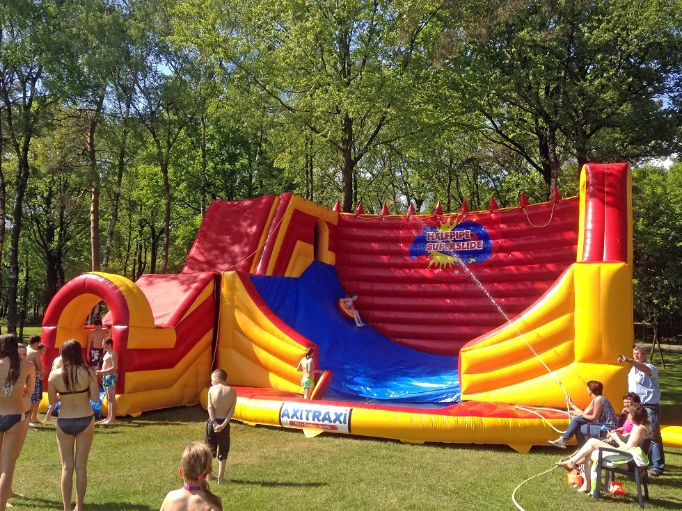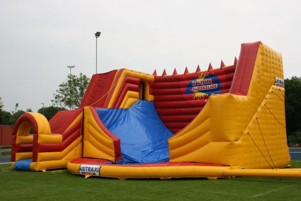Het huren van deze Halfpipe Superslide waterglijbaan is een gegarandeerd succes. Klim omhoog over het touwnet aan de schuine wand van deze spectaculaire waterglijbaan. Vergeet niet een bandje mee naar boven te nemen. Ga op de rand zitten en geef jezelf een zet. Je glijd met de tobbe van een steile helling naar beneden van deze waterglijbaan. Je gaat van rechts naar links en andersom. Onderaan kom je in een zwembadje uit en kun je de band aan de volgende deelnemers geven.