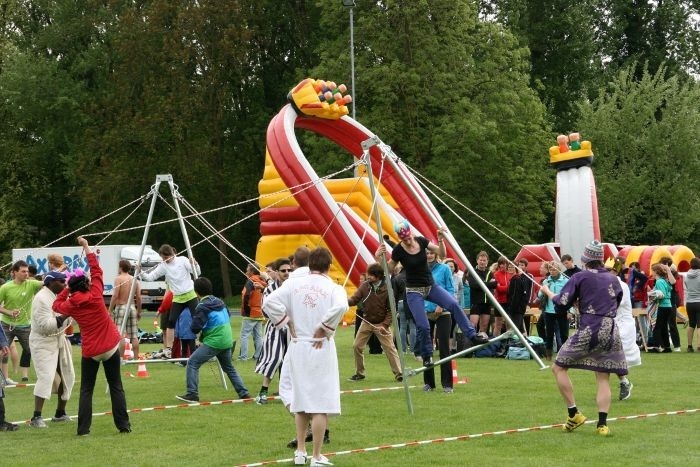 Bij het huren van de lopende A, neemt 1 persoon plaats op de A en verplaatst zijn of haar gewicht van links naar rechts. De rest trekt aan de touwen om de poot van de lopende A te verplaatsen. Probeer de poten om de beurt te verplaatsen en zo snel mogelijk al lopend aan de overkant te komen.