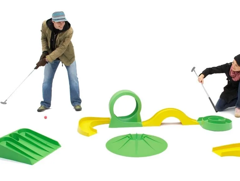 Huur hier een set van hindernissen om midgetgolf te spelen. Op het grasveld in de tuin, in het park, op de straat, op de camping, de parkeerplaats, op het werk in de kantine of thuis op de parketvloer, iedere ondergrond is geschikt.