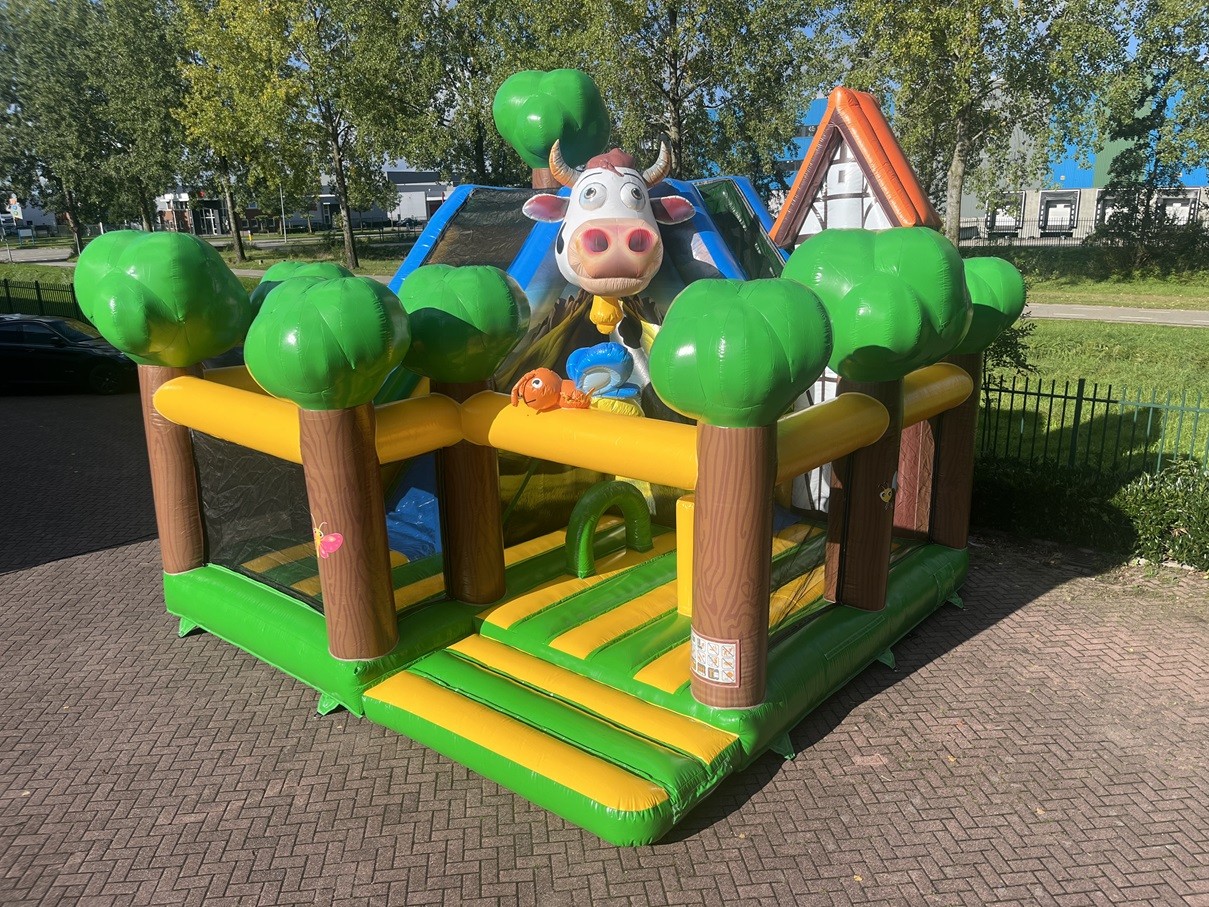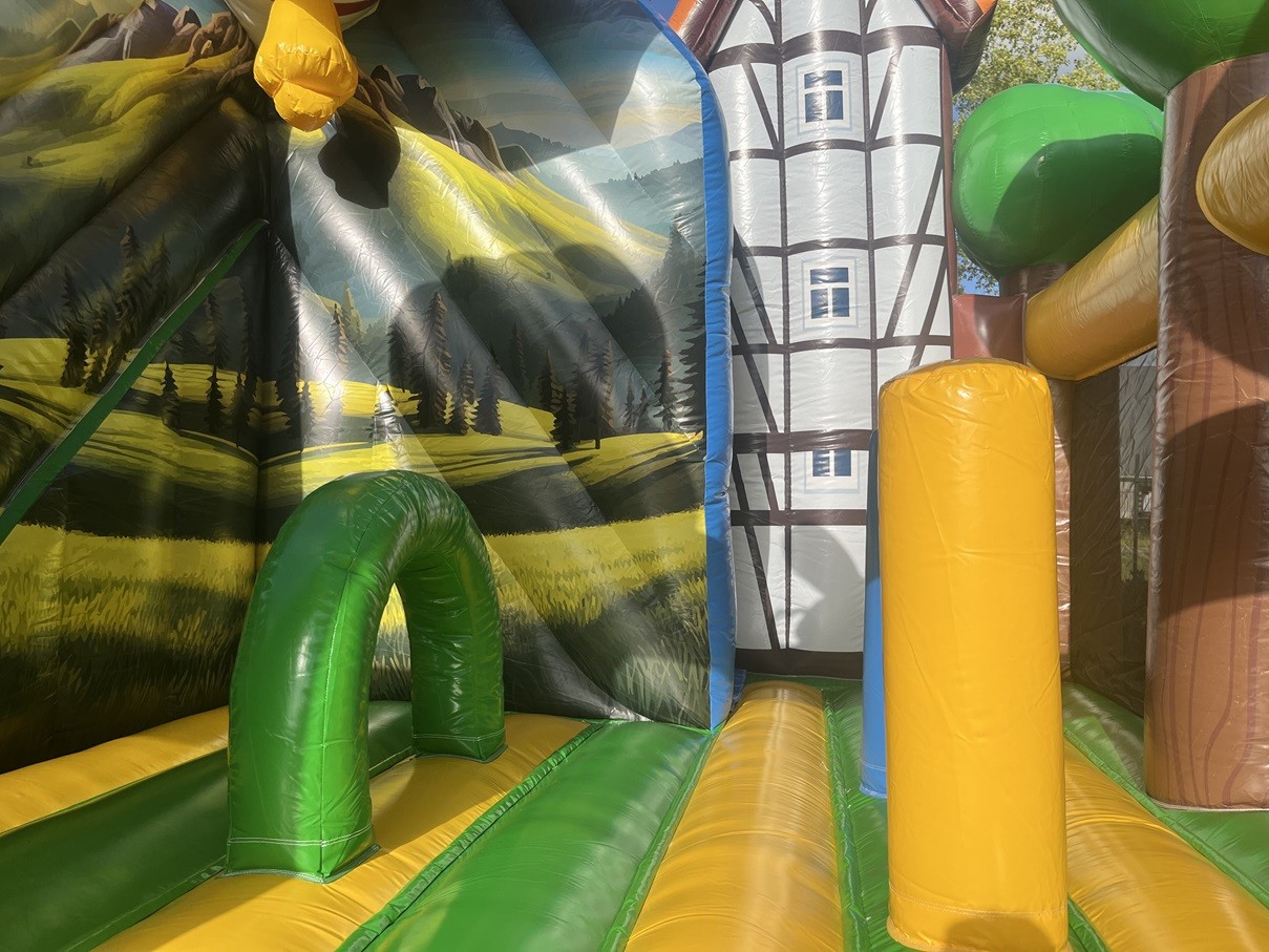 Dit springkussen Multiplay XL Tirol is een lust voor het oog. Dit mooie springkussen is volledig uitgevoerd in Oostenrijks thema met een koe, bergen en een vakwerk huisje. Het luchtkussen is aan de voorkant voorzien van een net zodat u de kinderen goed in de gaten kunt houden tijdens het springen.