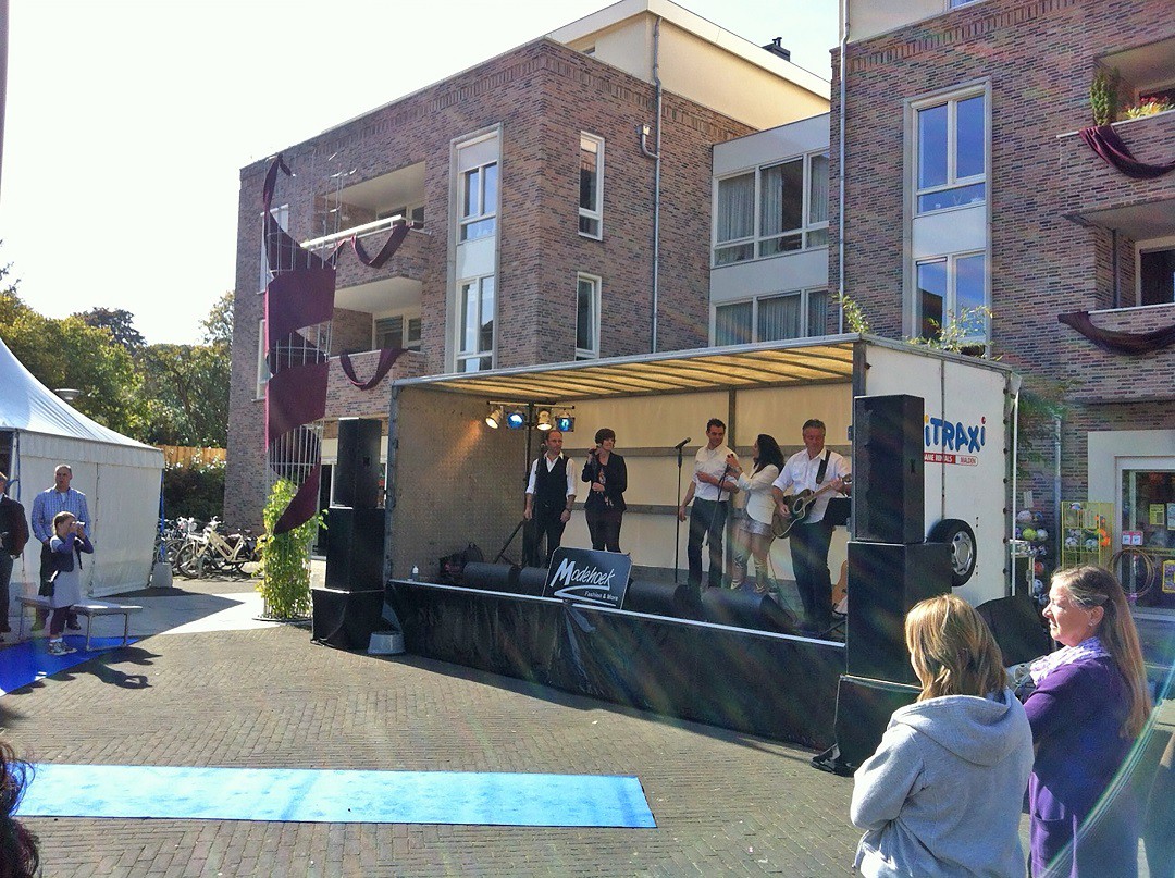 Huur hier een podiumwagen van 6 x 2,3 x 2,2 meter voor op uw evenement. Het is een dubbel-as podiumaanhanger met huif, vaste klep en rijplaat. Ideaal voor ieder evenement, geen gedoe met podiumdelen en uw optreden staat droog.