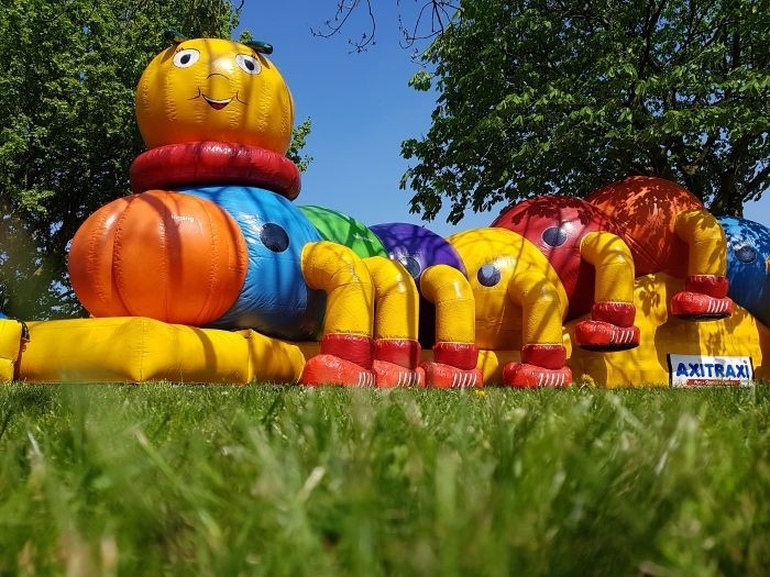 Huur de vrolijke speelrups van 15 meter vol springkussens en obstakels. Veilig, kleurrijk en uren speelplezier voor kinderen gegarandeerd!