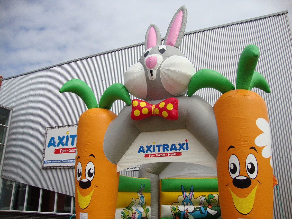 Huur bij Axitraxi dit mooie springkussen Konijn. Een kinderfeestje, opendag, braderie, hoe vermaakt u de kinderen? Huur een leuk springkussen! Dit luchtkussen trekt direct de aandacht van ieder kind, met zijn grote opblaasbare konijnenkop! Een springkussen biedt gegarandeerd vermaak, uren kunnen ze blijven rondhuppen, zonder zich te bezeren. Huur dit veilige springkussen daarom snel bij Axitraxi.