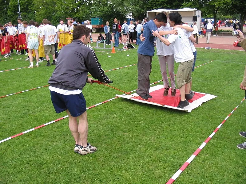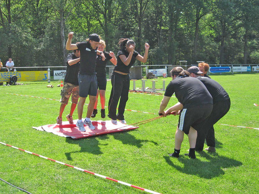 Huur het vliegend tapijt voor teambuilding! Spring met zijn allen tegelijk en 1 persoon trekt het vliegend tapijt een stukje naar voren. Kom niet langs het tapijt terecht en verplaats u zo snel mogelijk naar de overkant. Erg grappig om naar te kijken tijdens een zeskamp!